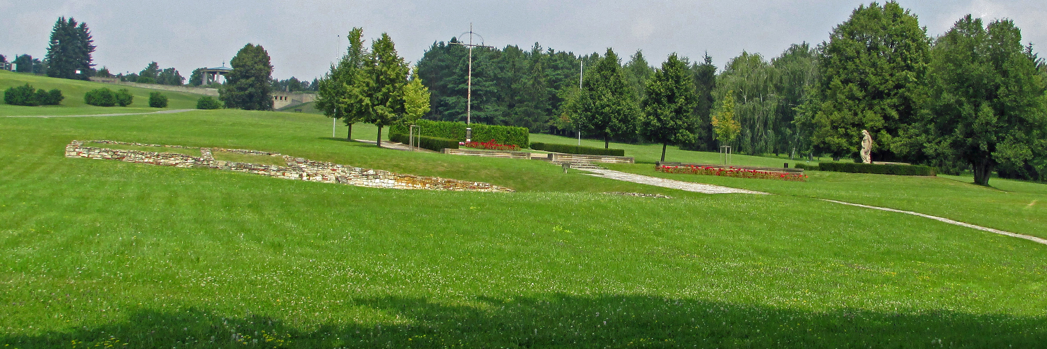 Between the new Lidice town site and the original location is a lovely rose garden. The flowers are a donation by many people from around the world as a response to the tragic events of June 10th 1942 when the town was destroyed and its residents killed. The roses form a bridge between the peaceful present and the violent past. The garden leads the visitor to a spot overlooking a large tree-lined field. The emptiness of the field stands as a ghostly testament to the town of Lidice which once existed there.