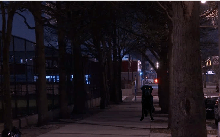 A vehicle stopped next to me as Jonah was guiding me to the curb near the cross street. The driver yelled, “There is a bear right across the street from you! Do you see it?
